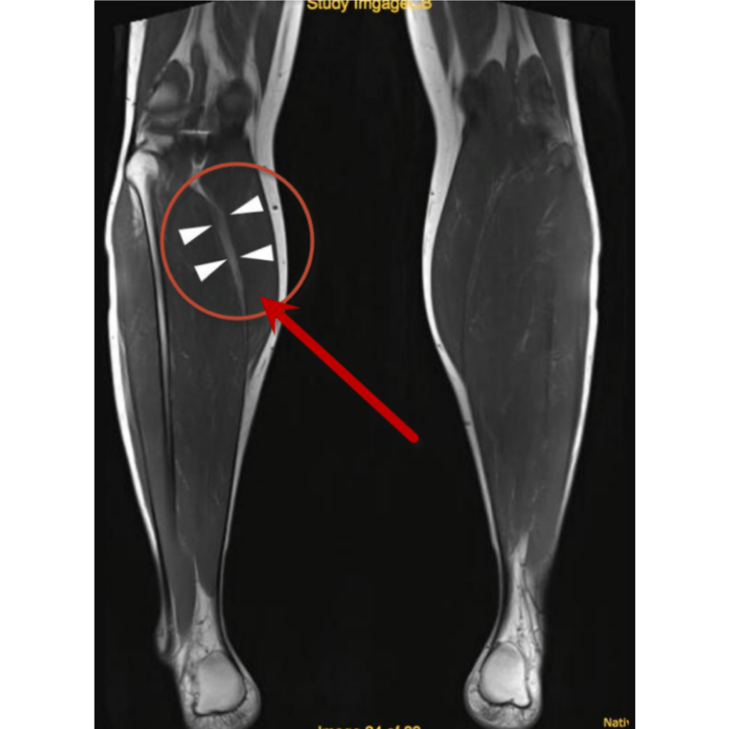 Un desgarro de segundo grado en el gemelo medial (músculo de la parte interna de la pantorrilla) el cual no necesito un tratamiento quirúrgico.Por lo que fue referido para su recuperación con terapia física.